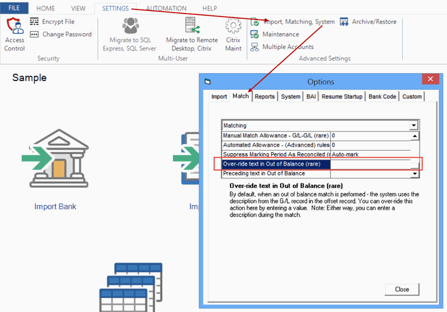 select the Settings tab > Import, Matching, System > Match tab > 'Over-ride text in Out of Balance (rare)'.