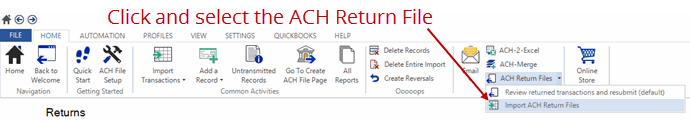 Simply import ACH Return files from the main menu