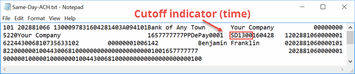 In addition to setting the effective date, many banks will want you to insert a cutoff indicator into the batch header (descriptive date field, positions 64 - 69).