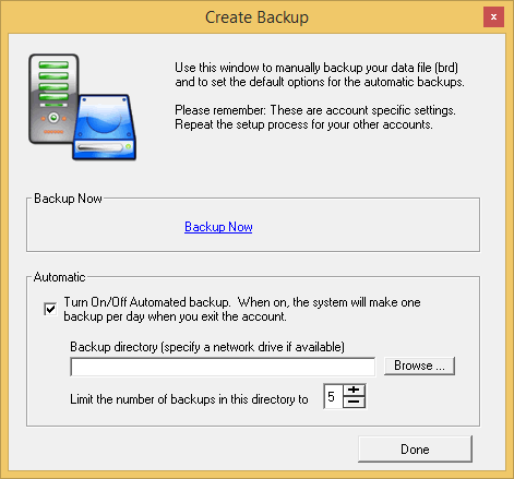 Enable your system to backup your data and settings using our built-in automated desktop backup. The backup can be sent to any shared drive on your network.